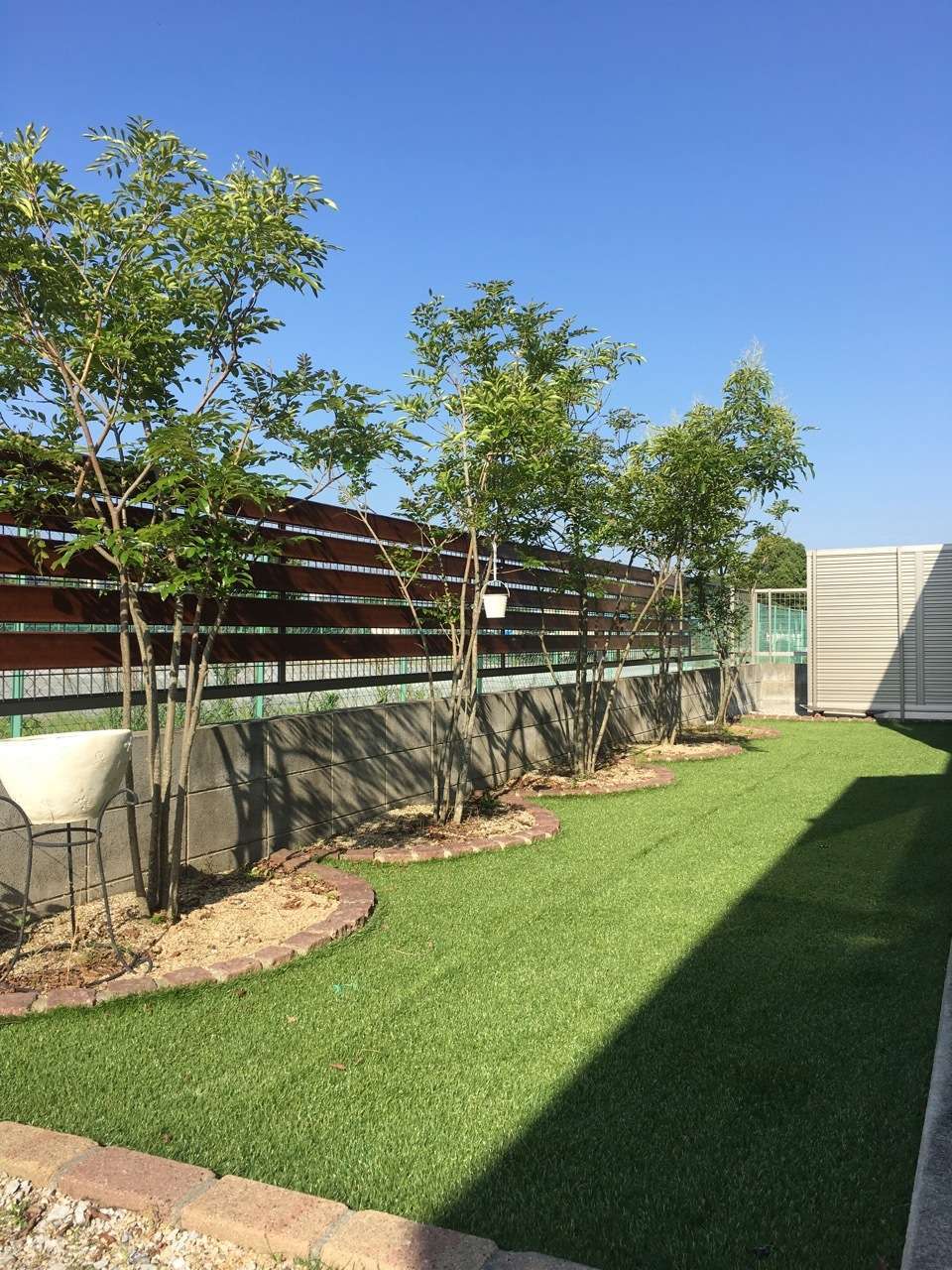 フェンスの木目調と人工芝と植栽の緑がとても合っていて、きれいですね♪