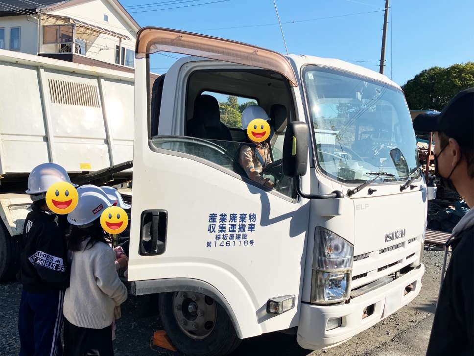 見学の始まりは、板屋建設の事業内容と建設業の社会的役割についての説明からスタートしました。「私たちが住む家や学校、道路や橋など、みんなの生活を支える大切な仕事をしているんだよ」という話に、どの子も真剣にメモを取り、集中して耳を傾けてくれました。