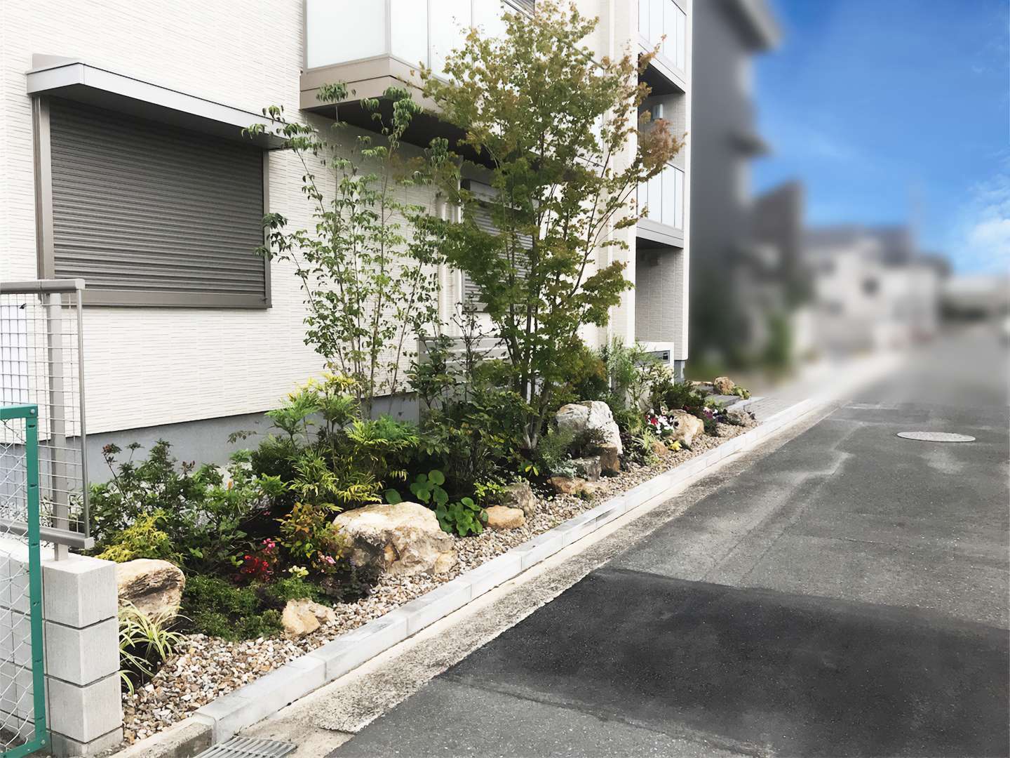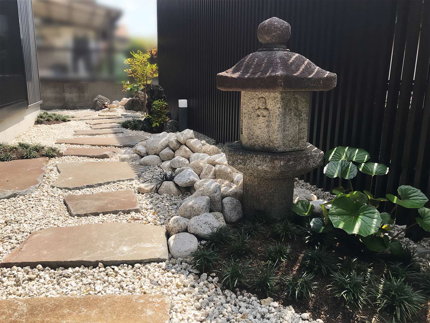 イロハモミジやタマリュウといった植栽だけでなく、灯篭や照明などもお客様のご希望に合わせて弊社でご用意させていただきました。
