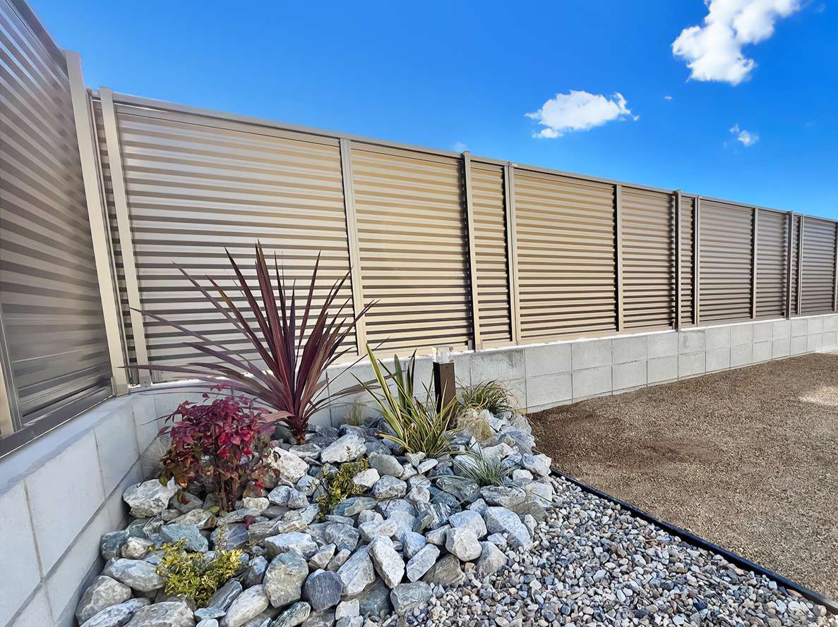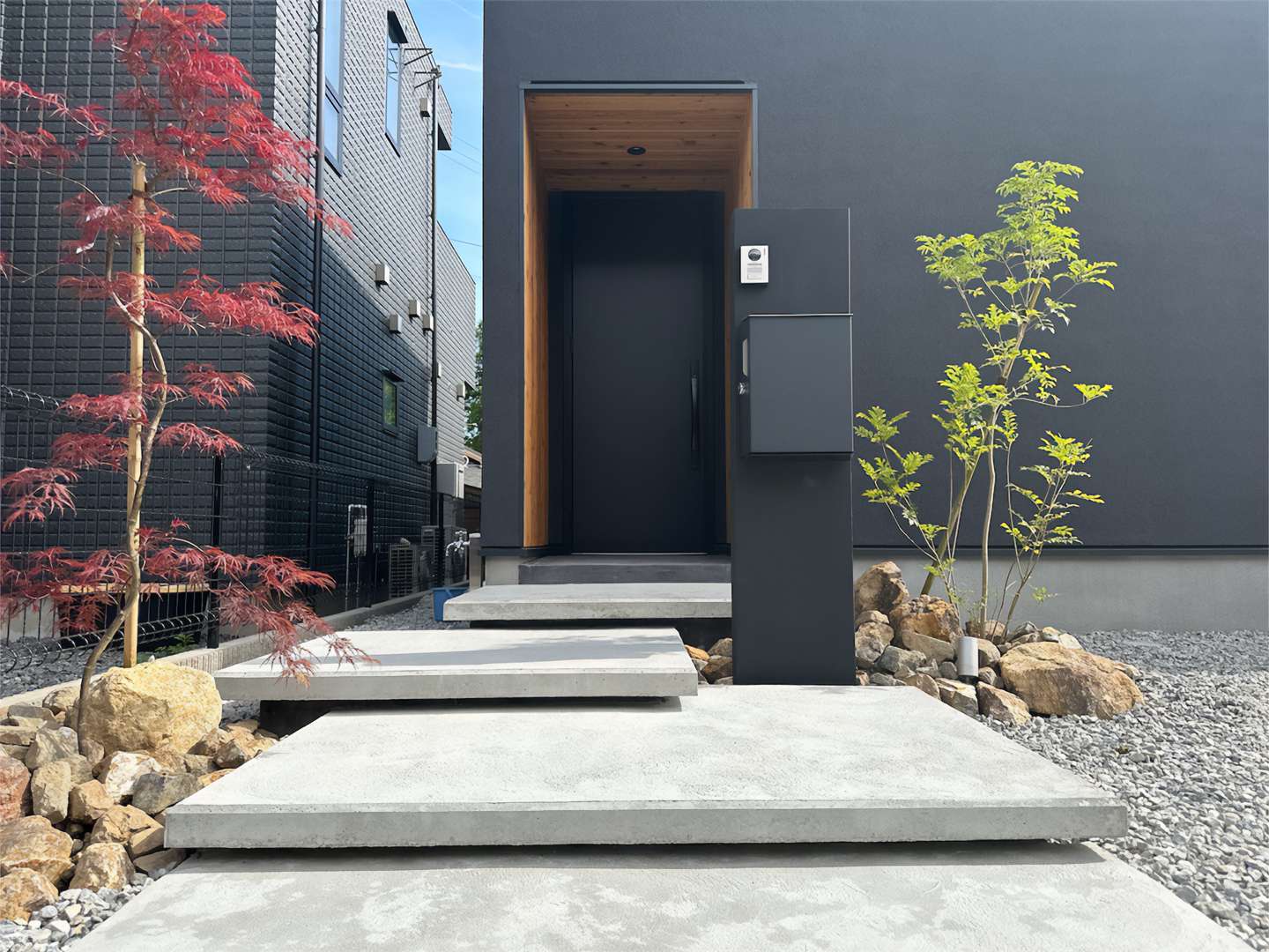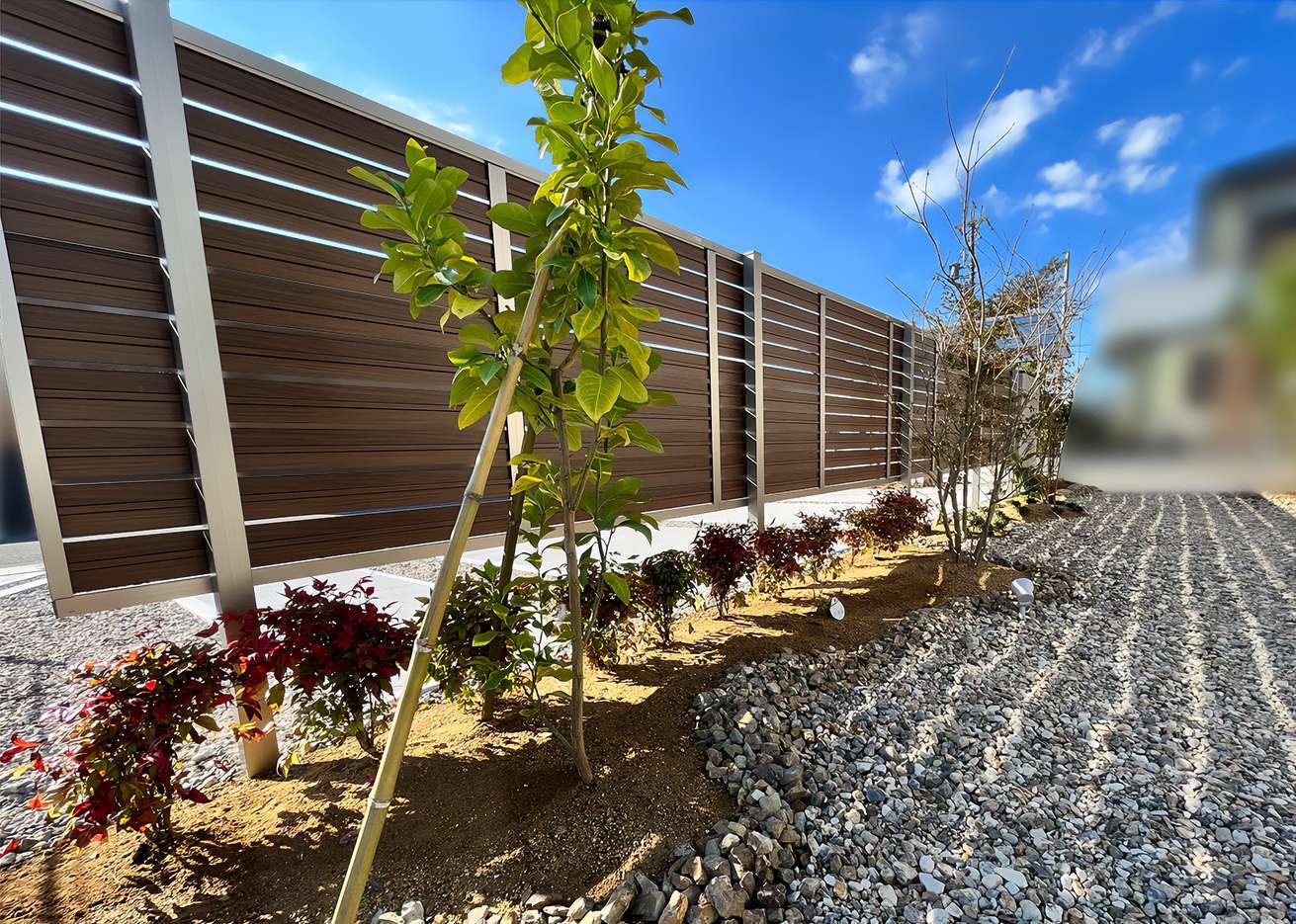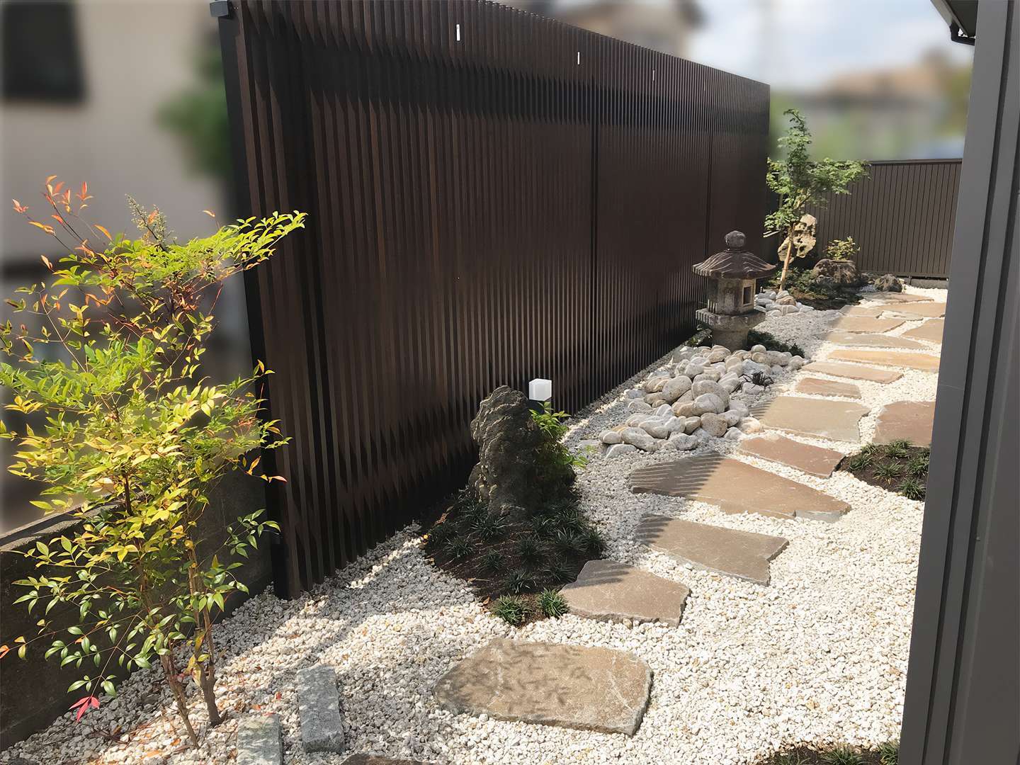 植栽をメインに、周囲に溶岩石やゴロタ石、飛石として鉄平石などを組み合わせることにより、和風庭園のような上品なお庭を造ることができます。また、フェンスの色を植栽と合わせることにより、より一層魅力的なお庭を演出することも。