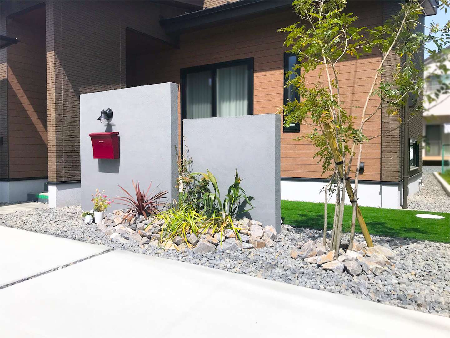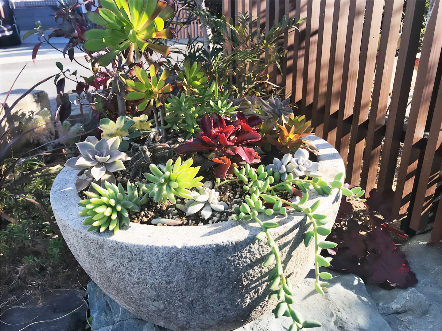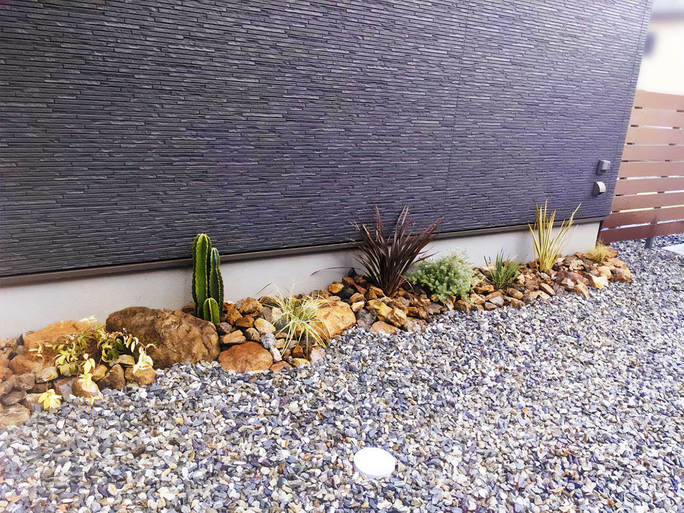 ドライガーデンは場所を取らず限られた空間にも配置ができることが嬉しいポイントですね。お庭だけでなく、玄関横のスペースにもおすすめです。個性豊かな植栽が玄関横を華やかに彩ってくれます。