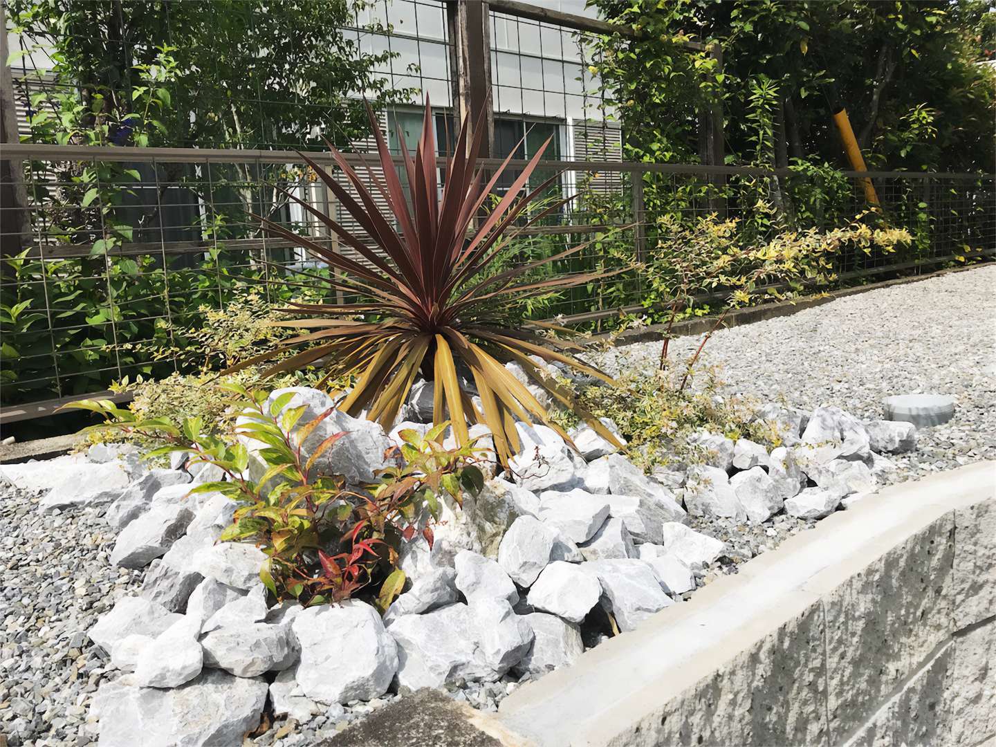サボテンにアロエ、コルディリネ・レッドスターやニューサイランなど、大きく迫力のある・鮮やかな植物をメインにアガパンカスやローズマリー、マホニアコンフューサーを植えることでバランスの取れたお庭に仕上がりますよ。