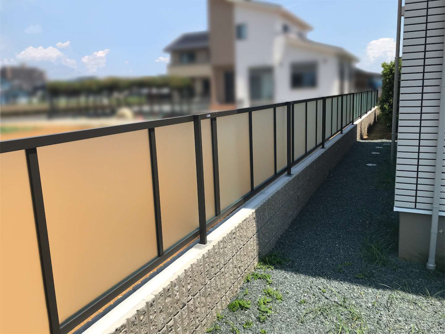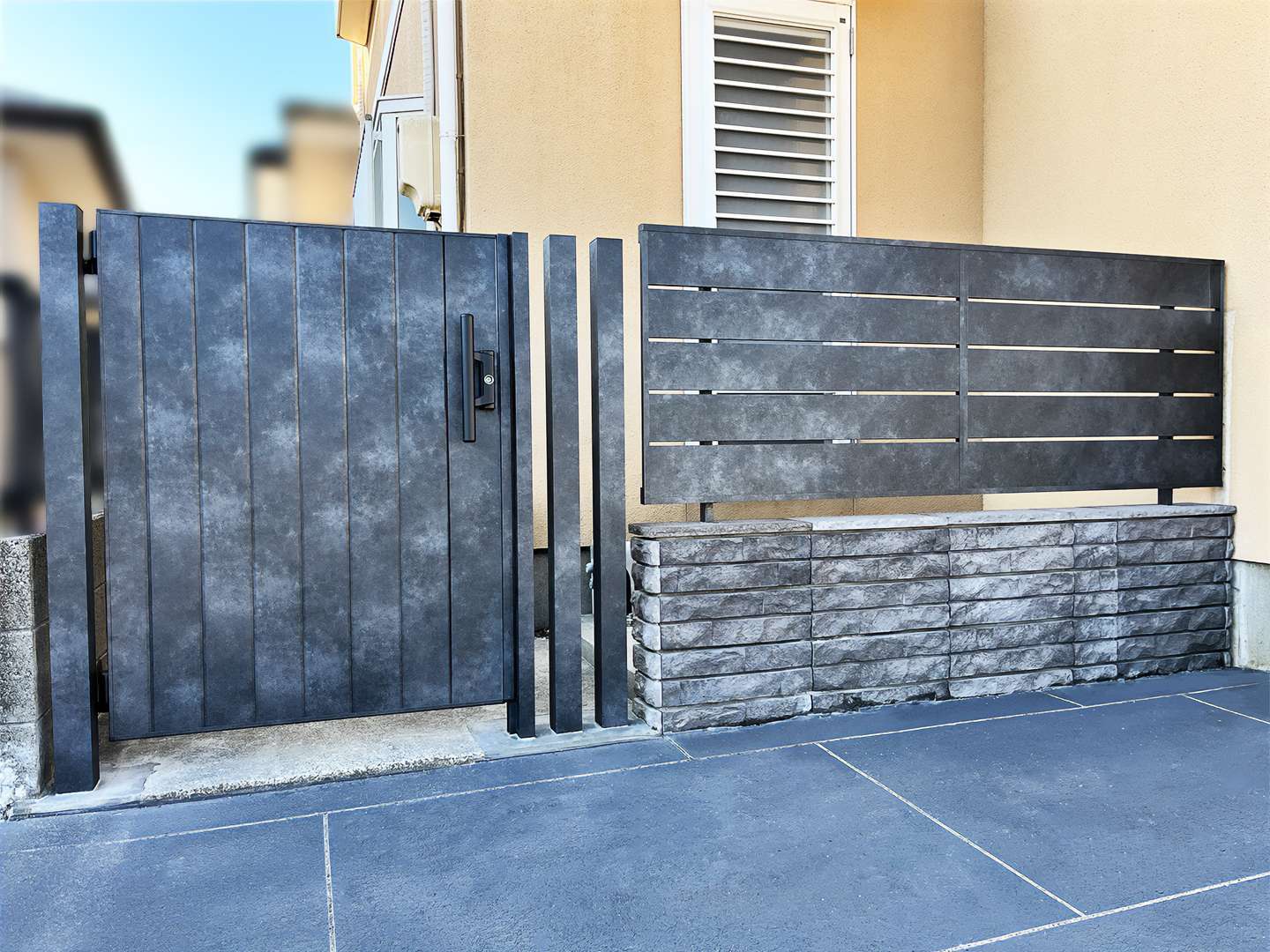 この事例では、フェンスの一部に化粧ブロックを使って高さを出し、モダンで高級感のある雰囲気に。化粧ブロックにすることで温かみのあるテクスチャーで見た目がとてもおしゃれに。アルミ製ですので丈夫で長持ちしメンテナンスもほぼいらない。子供がボールをぶつけてるとへこんでしまうこともあるので注意がひつようですね。