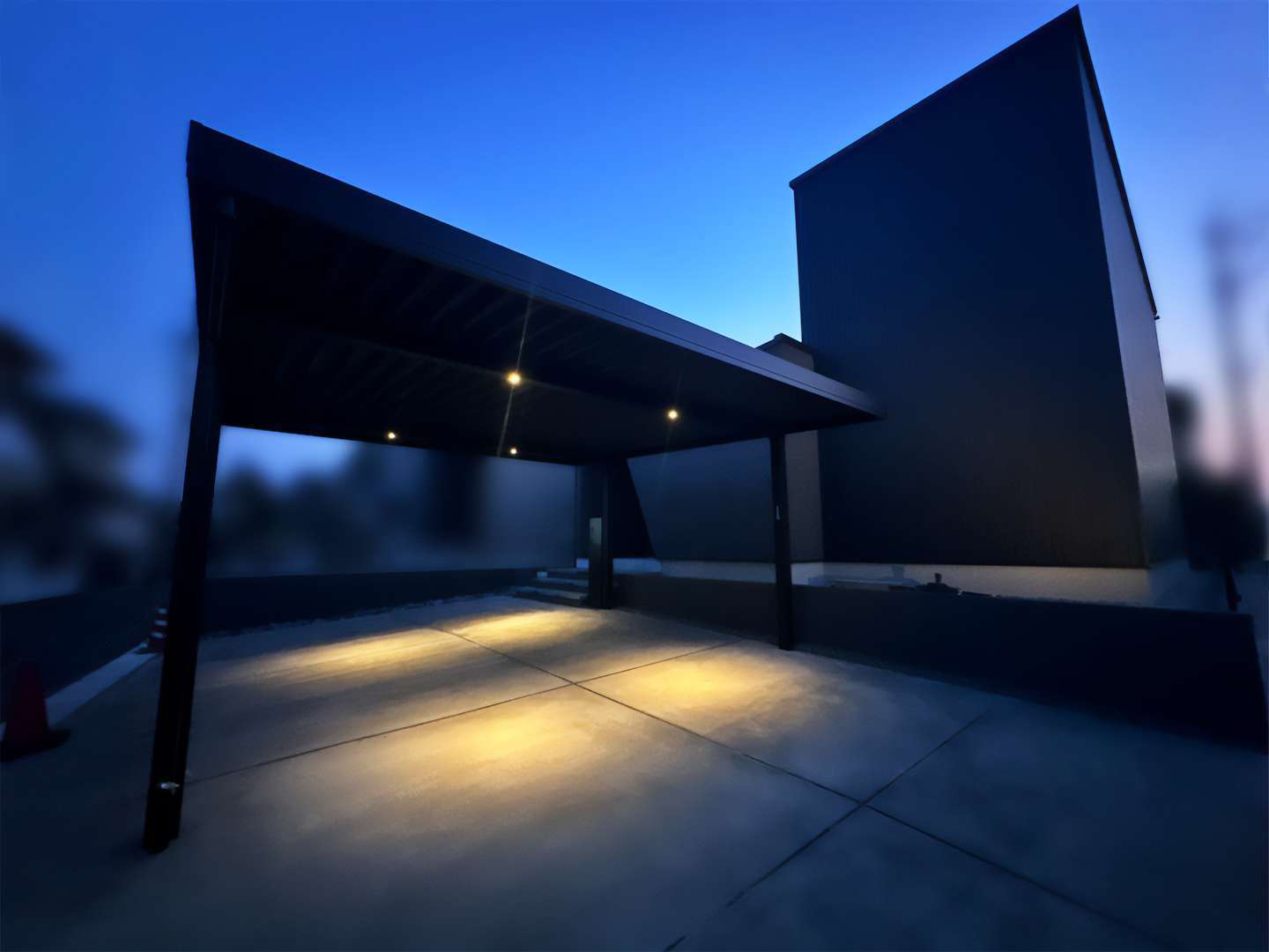 これが、モダン外構の価値を飛躍的に高める光です。シンボルツリーを下から照らし上げてそのシルエットを浮かび上がらせたり、建物の壁面を光でなぞるように照らして素材の質感を強調したり。あるいは、ウッドデッキやテラスに間接照明を仕込むことで、まるでリゾートホテルのような非日常的な空間を創り出すことも可能です。光と影を巧みに操ることで、夜の庭は家族だけの特別な舞台となります。