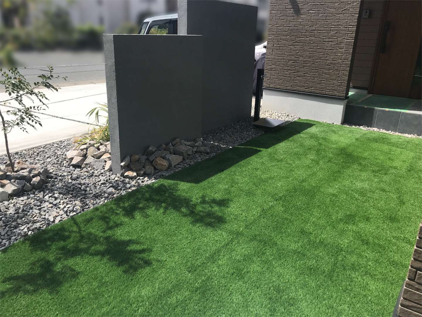 パレットローラー仕上げは、色ムラが少なく均一な塗膜が得られるため、スタイリッシュでシンプルな建物外観との相性が抜群です。また、門柱裏側には人工芝を敷設し、美観を保ちながら目隠し効果も確保しております。