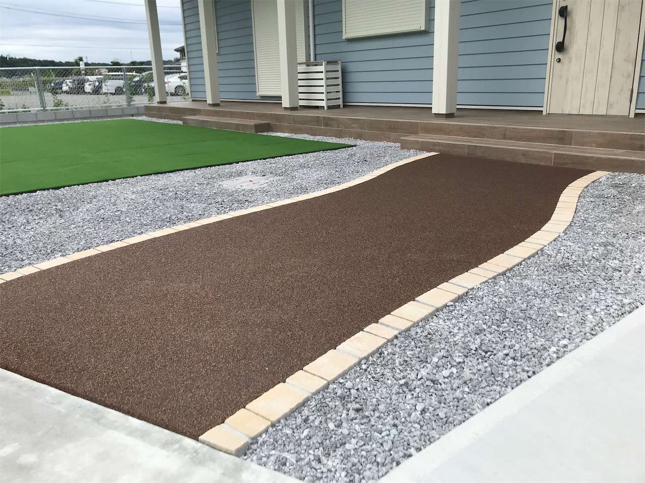 砂利が人工芝の中に入ってこないように、砂利と接するところには縁切り材を使用し砂利の防止策もしっかりしています。