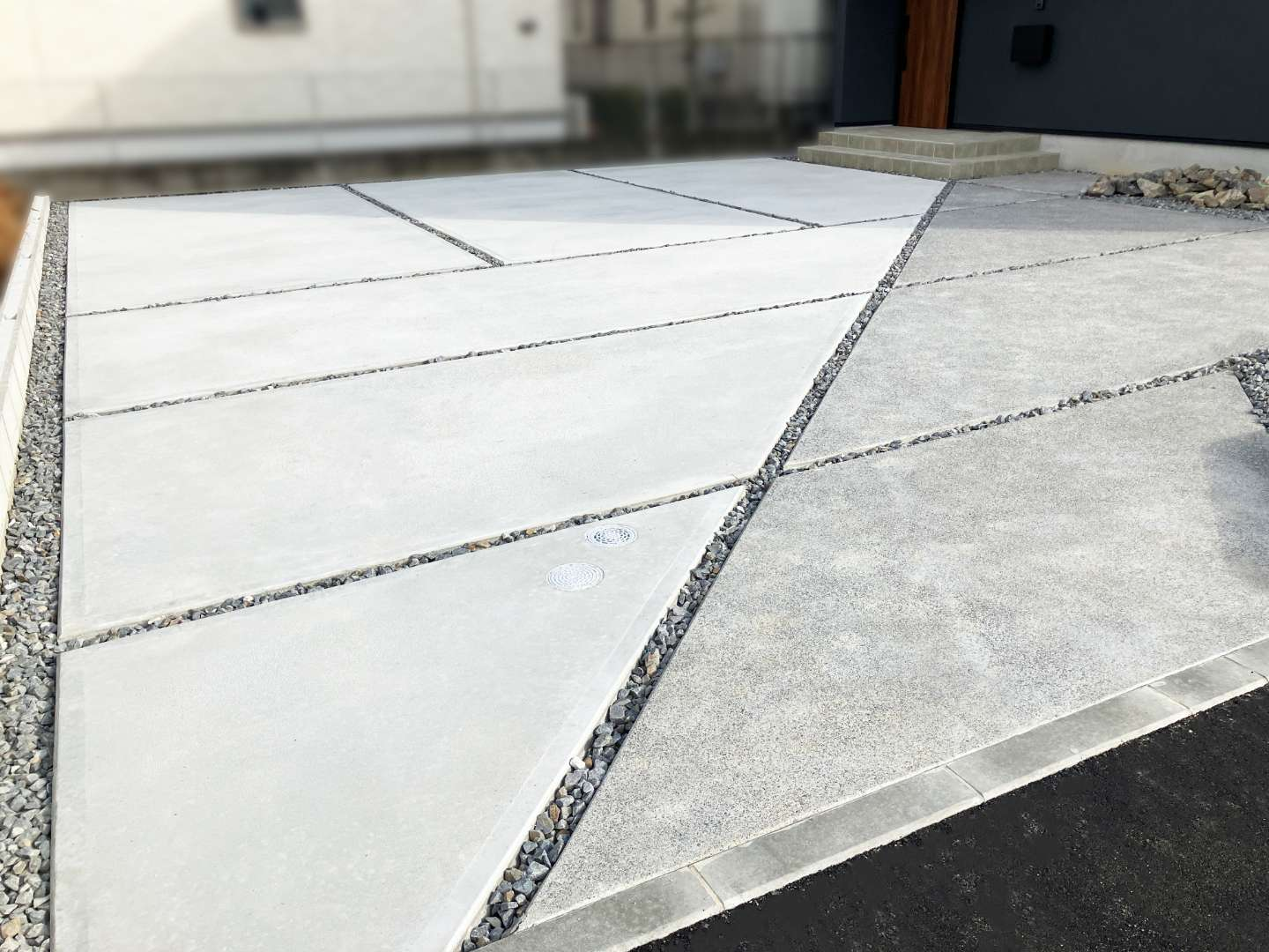 駐車場は愛車を三台余裕をもって収められる広い土間スペースを確保し、仕上げは土間コンクリートの刷毛引き仕上げと洗い出し仕上げの二種を採用しました。