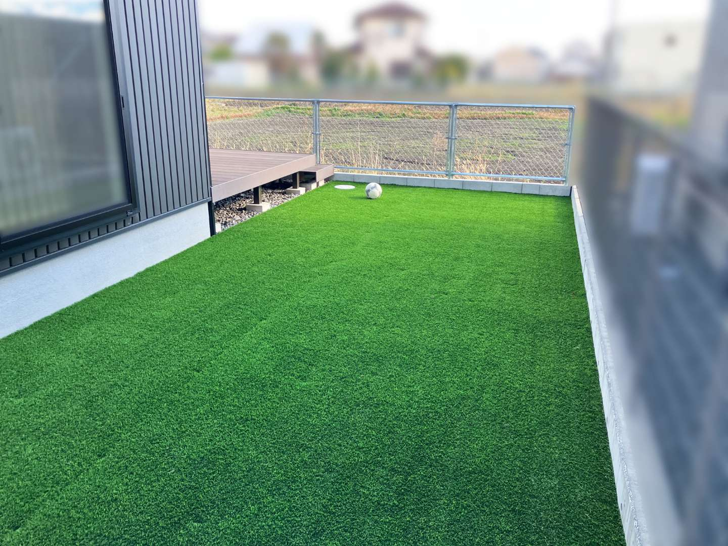 そこで本施工では、地面全体に防草シートを敷設したうえで人工芝を施工することで、雑草管理の手間を大幅に削減し、一年を通じて美しい緑を保てる快適なお庭に仕上げました。