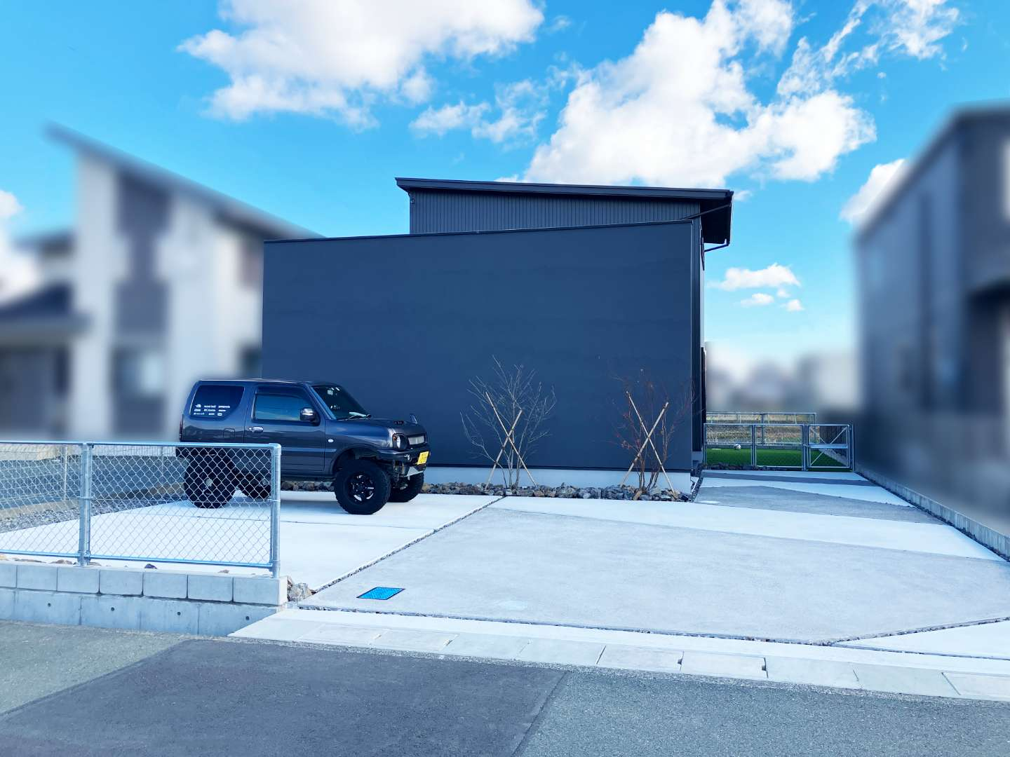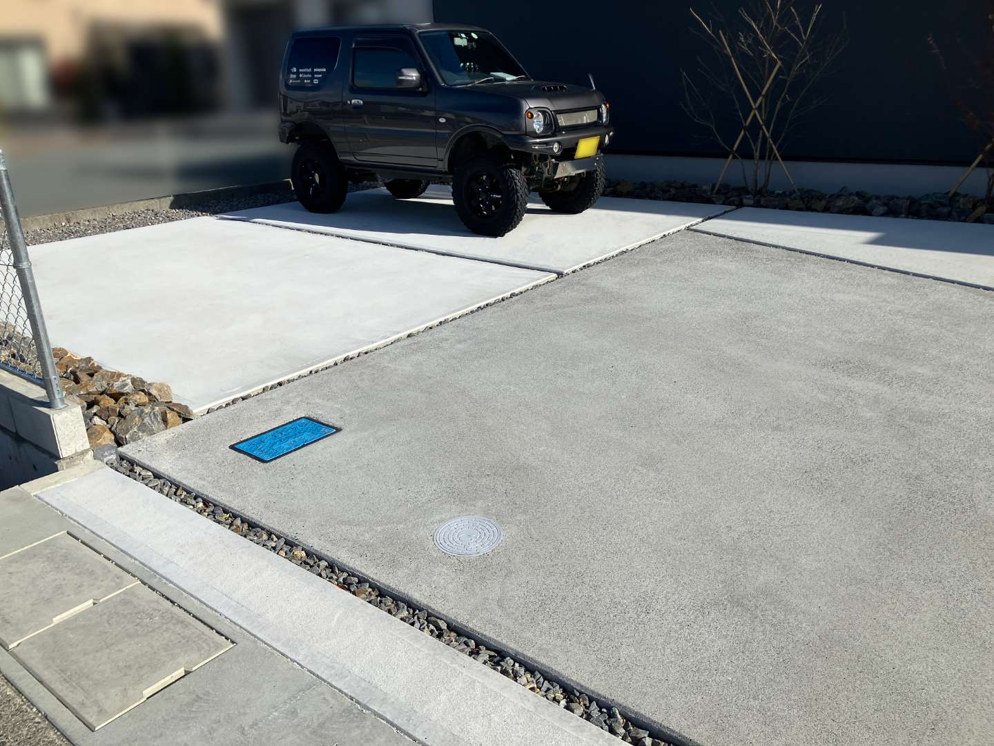 駐車場はシンプルモダンな建物の外観に調和するよう、土間コンクリート仕上げを採用しました。