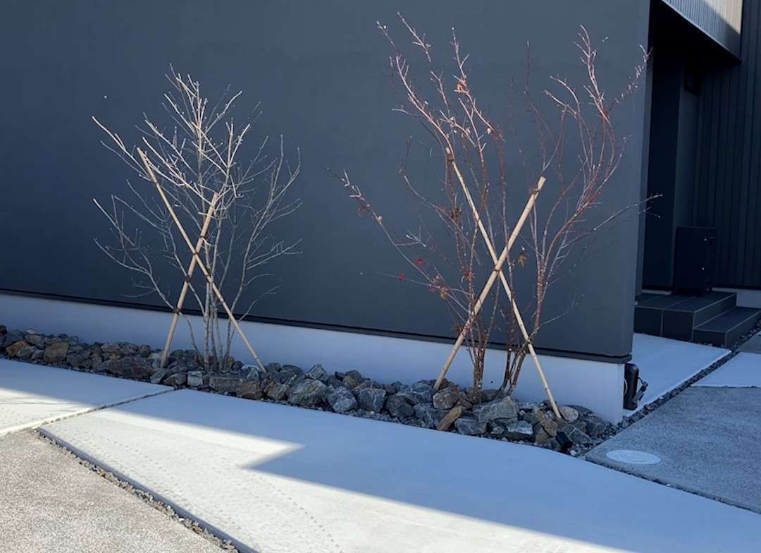 玄関前のアプローチには、シンボルツリーとしてアオダモとイロハモミジを植栽しました。
